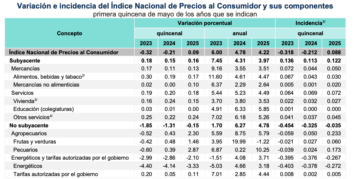 El Índice Nacional de Precios al Consumidor avanzó 0.09 % frente a la quincena previa, su mayor alza para este periodo desde 2020, y llevó la inflación anual a 4.22 %. El componente subyacente, que refleja la tendencia de fondo, creció 0.16 % quincenal y 3.97 % anual, mientras que el no subyacente cayó 0.15 % pero aún muestra un aumento anual de 4.78 %. El resultado rebasó el consenso de analistas y saca al índice del rango objetivo de Banxico (3 % ± 1).