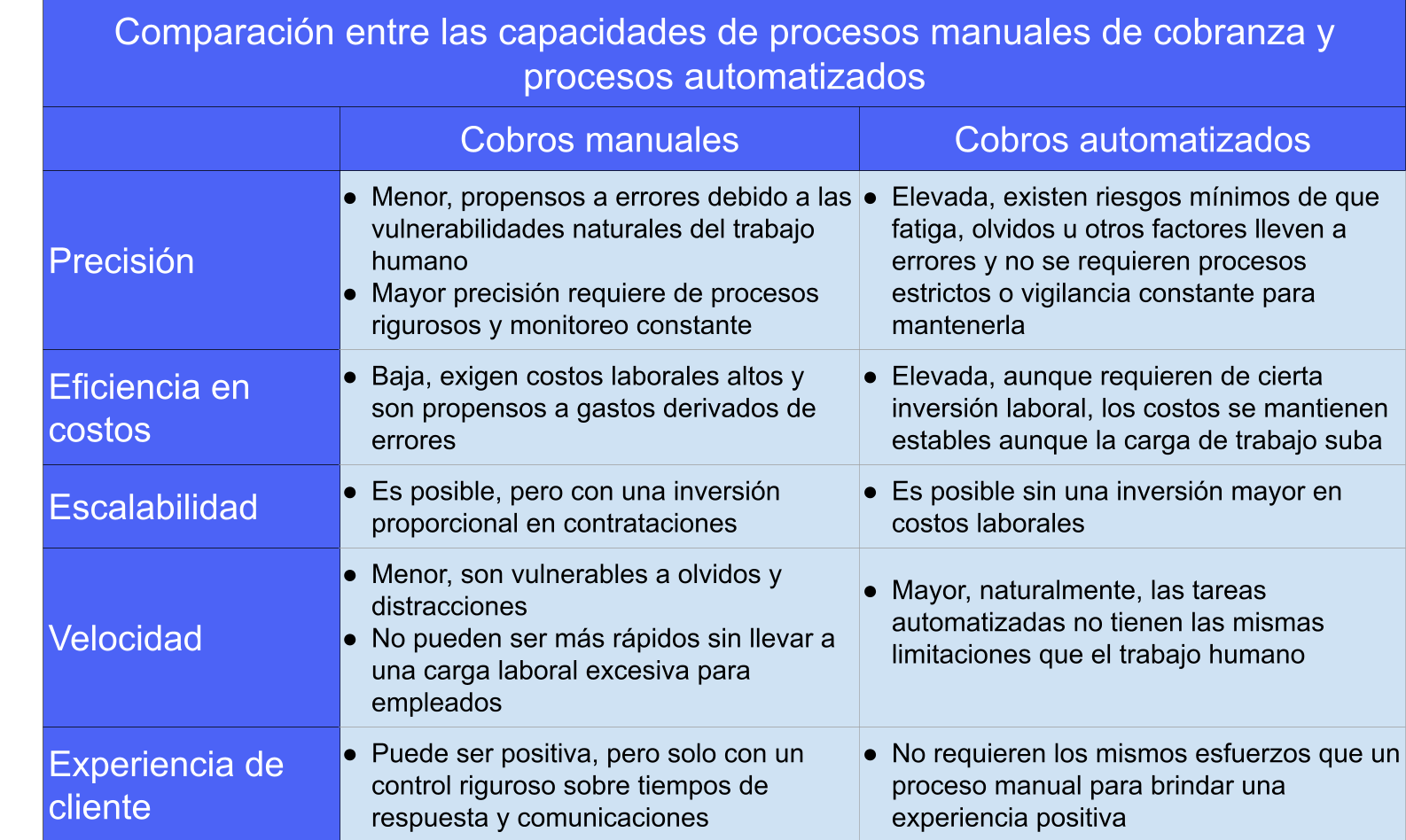 Aunque los buenos procesos manuales de cobro aún son efectivos y relevantes para respaldar una infraestructura digital, automatizar varias de las tareas que estos abarcan es buena idea debido a que esto cubre más fácilmente las desventajas que la gestión manual implica naturalmente, como la vulnerabilidad a errores y olvidos, las limitaciones en velocidad y los costos laborales crecientes.