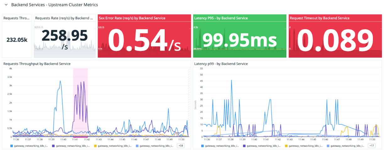 - Visibilidad detallada de request rates, latencia, errores y comportamientos de upstream/downstream
