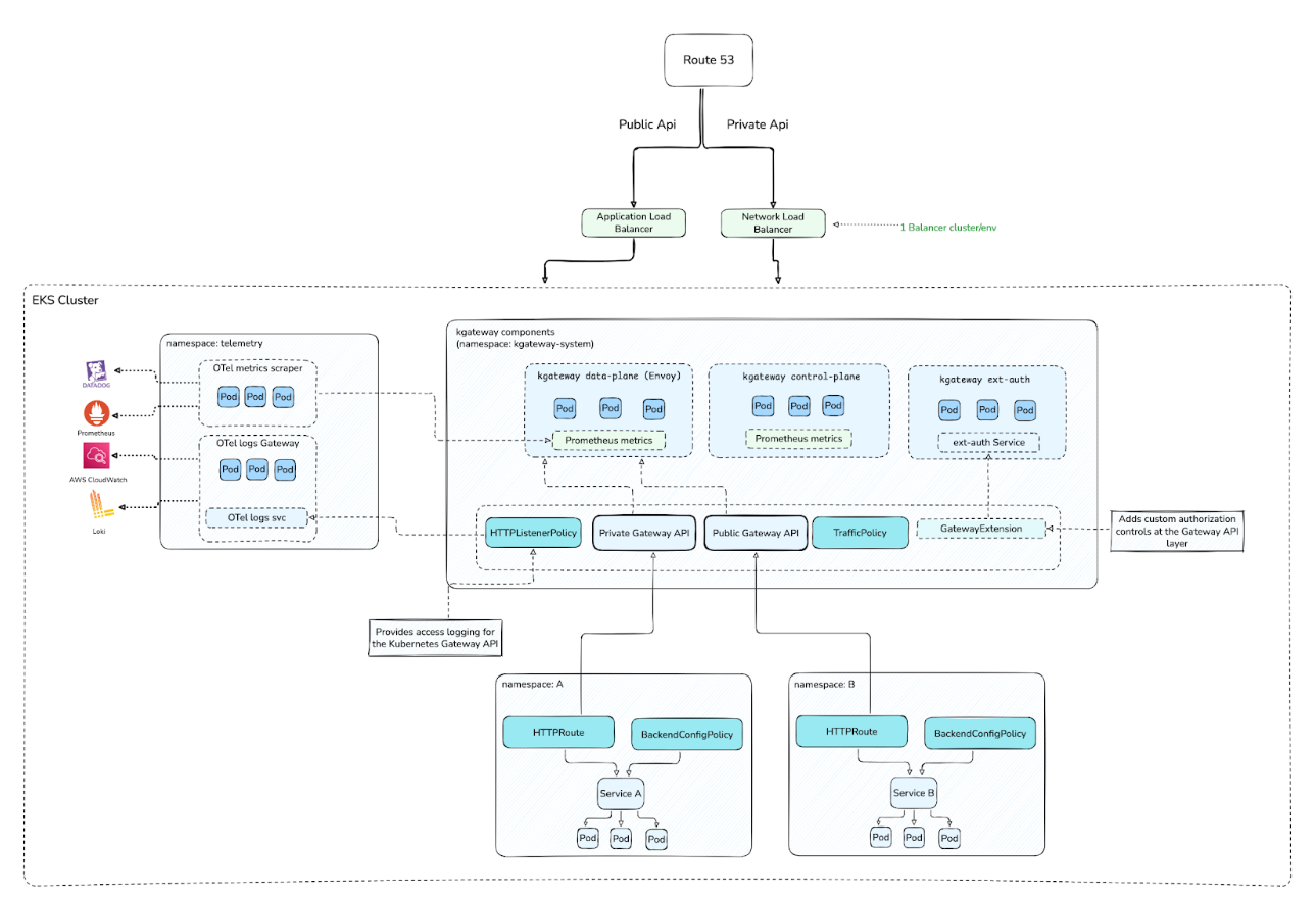 Cuando el tráfico llega a la plataforma, ya sea a través de un Application Load Balancer para tráfico público o un Network Load Balancer para tráfico interno, ambos flujos pasan a través de los proxies Envoy en el data plane de kgateway. Desde allí, todo el enrutamiento se maneja de forma declarativa dentro de Kubernetes.