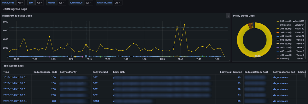 A través de nuestros dashboards de Grafana, podemos profundizar fácilmente en los códigos de respuesta e investigar respuestas no-200 con más detalle cuando sea necesario.