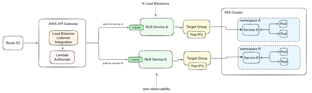 Al operar de una forma en que AWS API Gateway controla todo el tráfico entrante a los clusters de EKS a través de Network Load Balancers (NLBs), comenzamos a enfrentar varios problemas: