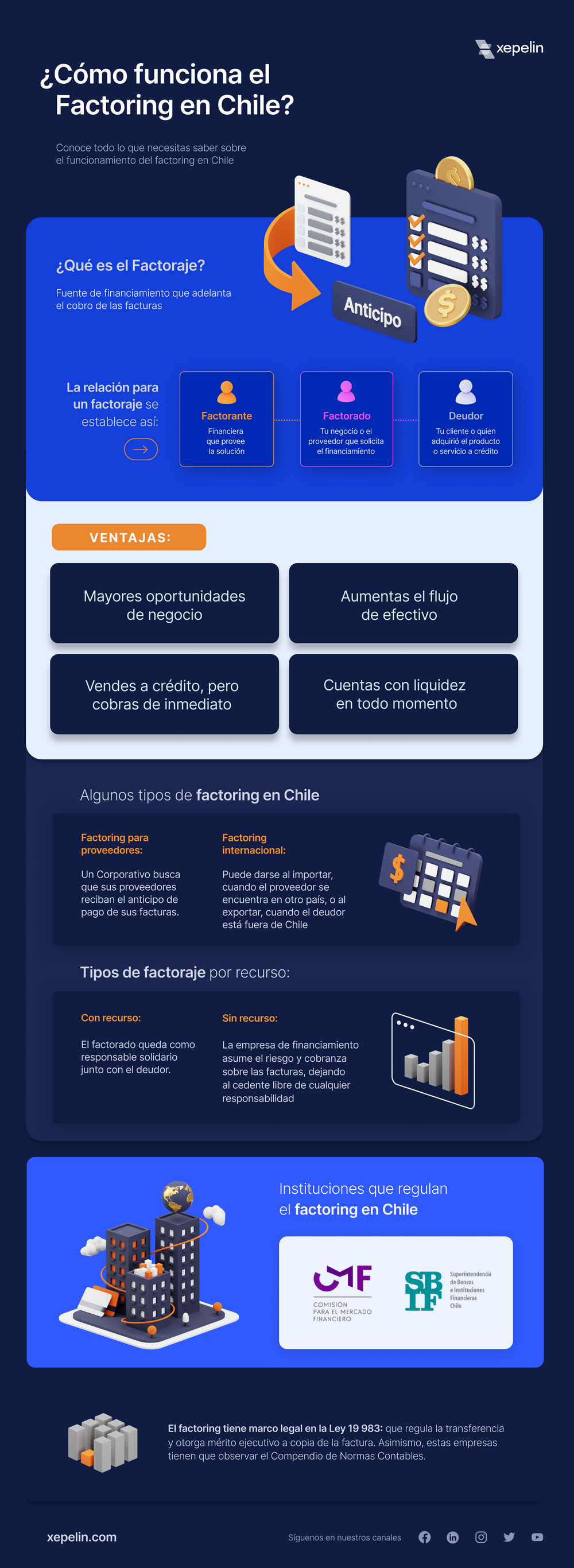 Actualmente, Xepelin es la fintech más importante en Chile, especialistas en soluciones de factoring y crédito de capital de trabajo para pequeñas y medianas empresas, han apoyado a más de 5 mil Pymes y creado cerca de 105 alianzas con corporativos. Con nosotros puedes acceder a un factoring rápido y 100% digital, financiar tus cuentas por cobrar de forma inmediata, incluso, el mismo día en que se emitió la factura, reciben cuentas por cobrar de cualquier cliente sin montos mínimos ni máximos y su tasa de interés es una de las más bajas del mercado.