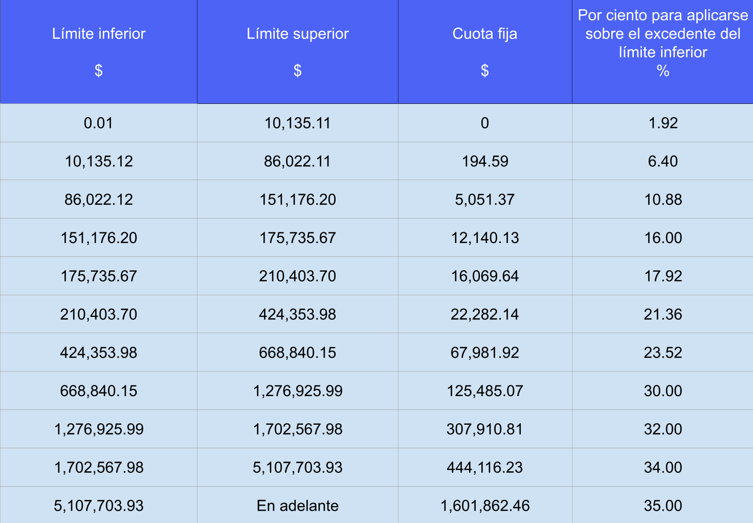 Para llevar a cabo este cálculo, primero se debe tener en cuenta las tarifas vigentes que se encuentran en el Anexo 8 de la Resolución Miscelánea Fiscal 2026, que van del 1.92% hasta el 35% sobre el ingreso bruto y son determinadas conforme a la inflación, así como los rangos a los que aplica cada una. Esto en el caso de las personas físicas, ya que para personas morales, su tasa será del 30% de manera fija.