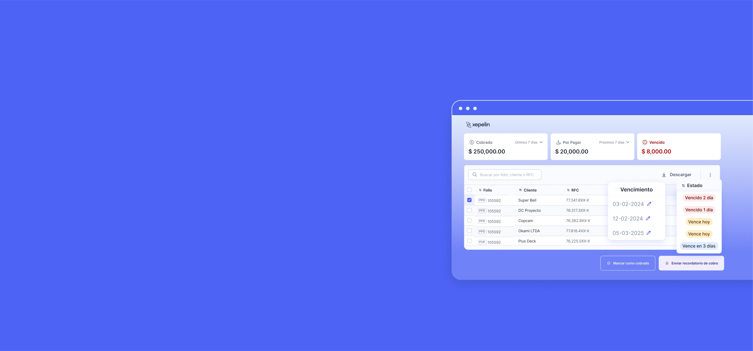 de vencimiento automáticas. - Visualiza reportes en tiempo real de tus cobros
